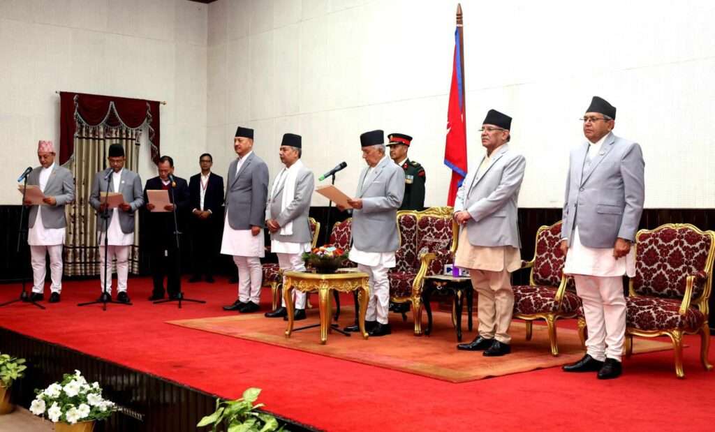 सोमबार नेकपा एमालेका प्रमुख सचेत पदम गिरी, माओवादी केन्द्रका हितबहादुर तामाङ र रास्वपाका डोलप्रसाद अर्याल (डिपी) ले राष्ट्रपति रामचन्द्र पौडलसमक्ष विनाविभागीय मन्त्रीको शपथ लिए सँगै सत्ता गठबन्धन औपचारिकरुपमा परिवर्तन भएको छ ।
