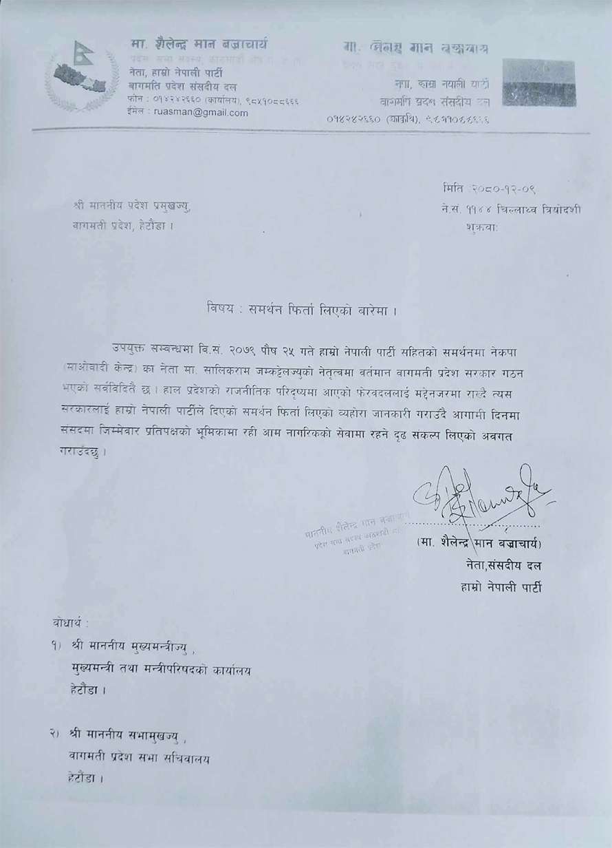 हानेपाले प्रदेश प्रमुखलाई पत्र लेख्दै सरकारलाई दिएको समर्थन फिर्ता लिएको जनाएको छ । हानेपा संसदीय दलका नेता शैलेन्द्रमान बज्राचार्यले चैत ९ गतेदेखि सरकारलाई दिएको समर्थन फिर्ता लिएको भए पनि मंगलबार मात्र पत्र दर्ता गरेका हुन् । उनले इमेलमार्फत पत्र दर्ता गराएको प्रदेश प्रमुखको कार्यालयले जनाएको छ । यस दलले मुख्यमन्त्रीको कार्यालयलाई पठाएको पत्र मुख्यमन्त्री तथा मन्त्रिपरिषद्को कार्यालय हेटौंडा र वाग्मती प्रदेश सभा सचिवालय हेटौंडालाई समेत बोधार्थ जानकारी दिएको छ ।
