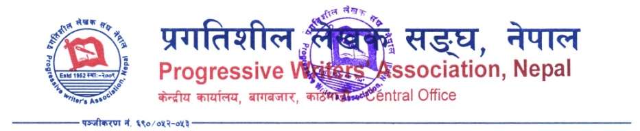 काठमाडौँ । प्रगतिशील लेखक सङ्घको ७२औँ स्थापना दिवसमा विभिन्न स्रष्टाहरू सम्मानित हुने भएका छन् । आगामी आश्विन ५ गते नपाल प्रज्ञा प्रतिष्ठानको लेखनाथ कक्षमा दिउँसो ११ बजेबाट हुने सो कार्यक्रमको प्रमुख अतिथि नेपाल सरकारका संस्कृति तथा नागरिक उड्डयन मन्त्री सूदन किराँती हुने जानकारी हुन आएको छ ।