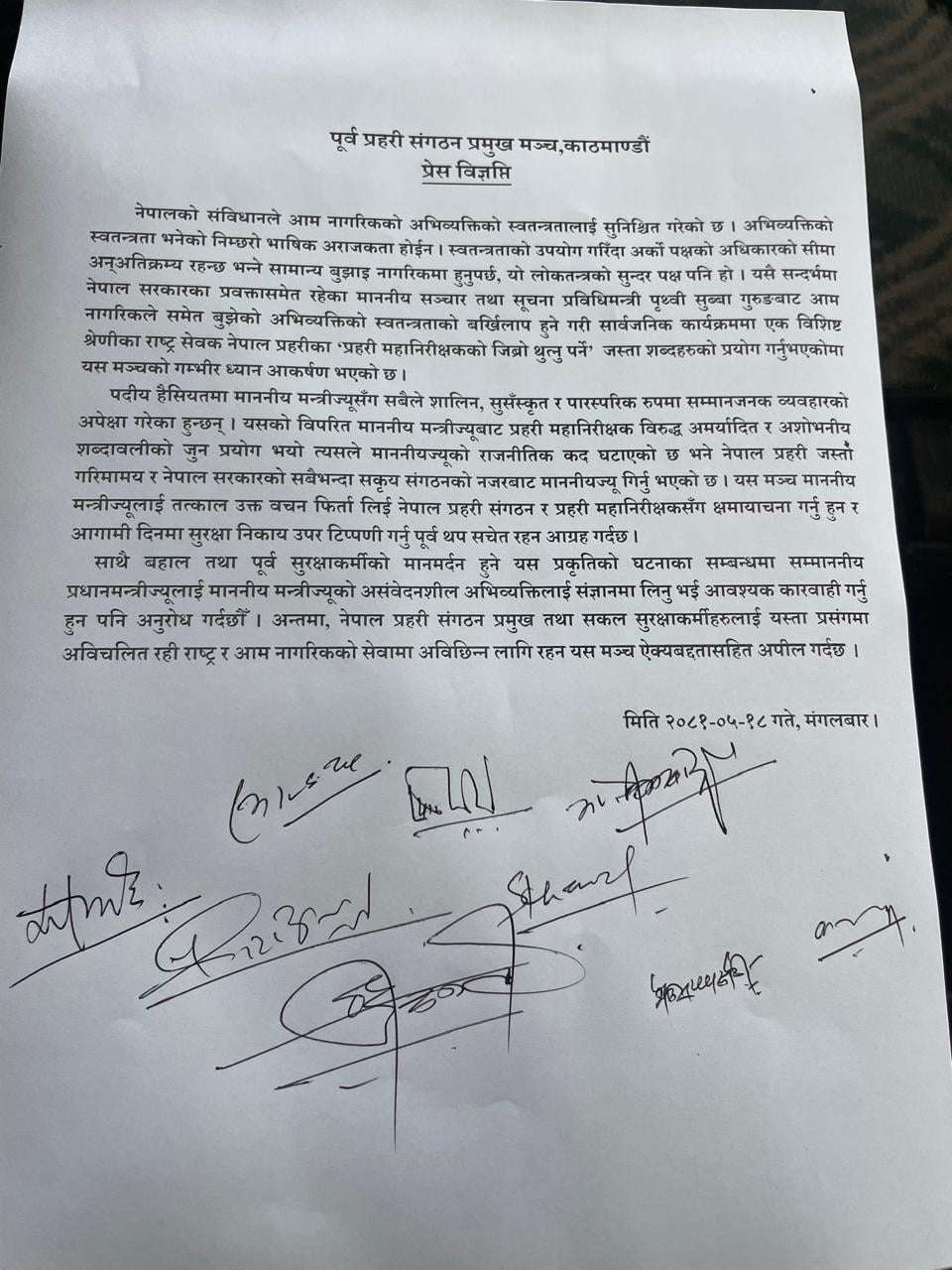 ‘बहाल तथा पूर्व सुरक्षाकर्मीको मानमर्दन हुने यस प्रकृतिको घटनाका सम्बन्धमा सम्माननीय प्रधानमन्त्रीज्यूलाई माननीय मन्त्रीज्यूको असंवेदनशील अभिव्यक्तिलाई संज्ञानमा लिनु भई आवश्यक कारवाही गर्नु हुन पनि अनुरोध गर्दछौ’ विज्ञप्तिमा छ,’नेपाल प्रहरी संगठन प्रमुख तथा सकल सुरक्षाकर्मीहरुलाई यस्ता प्रसंगमा अविचलित रही राष्ट्र र आम नागरिकको सेवामा अविछिन्न लागि रहन यस मञ्च ऐक्यबद्धतासहित अपील गर्दछ।’