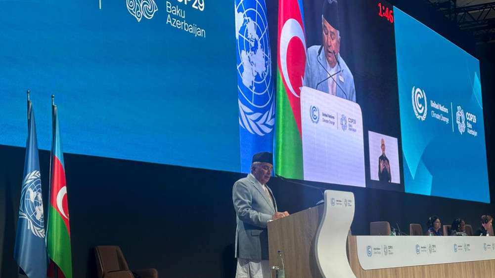 अजरबैजानको राजधानी बाकुमा मंगलबारबाट सुरु भएको जलवायु परिवर्तनसम्बन्धी संयुक्त राष्ट्र संघीय संरचना महासन्धि पक्ष राष्ट्रहरुको २९ औं सम्मेलन (कोप–२९) मा विश्व नेताहरूको उच्चस्तरीय सत्रलाई सम्बोधन गर्दै राष्ट्रपति पौडेलले भने,‘हिमालको सुरक्षा भनेकै पृथ्वीको सुरक्षा हो भन्ने कुरा सबैले ख्याल गरौं, पर्वतीय मुलुकका सेता हिमाल काला पहाडमा परिणत हुने क्रमले ती मुलुकमा मात्र होइन तल्लो तटीय मुलुकहरूलाई संकटमा पुर्याउँछ भन्ने विश्वले बिर्सन हुन्न ।’